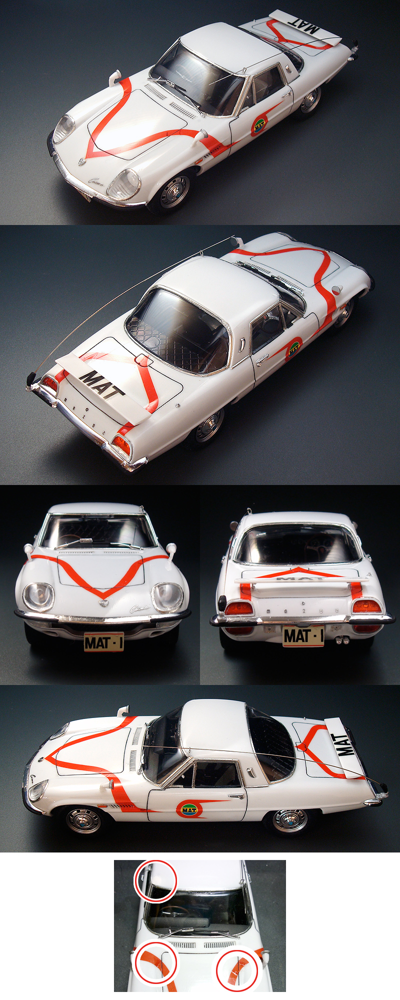 | ★完成2009年10月★基本工作を施したストレート組です★ボディは成形色を磨き込んでそのまま使用しています★トップコートはウレタンクリヤーを使用しています★軽く研出ししてデカールの段差を目立たなくしてあります★コンパウンド→ワックスのツヤ有り仕上げです★ウインドモール・ライトモールはメッキシールを使用しています★フロントのエンブレムとサインおよびリヤのMAZUDAの文字はエッジングパーツです |