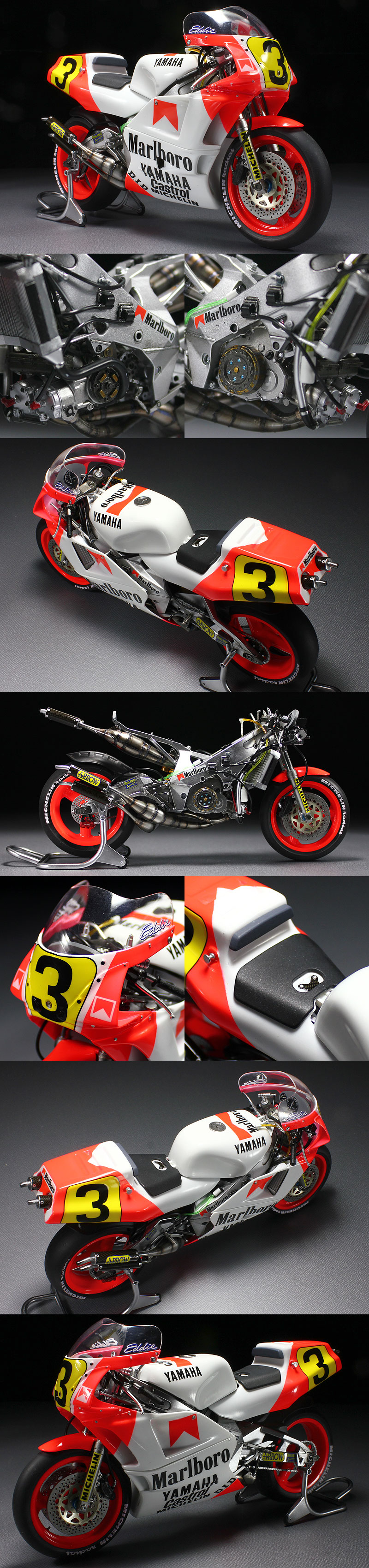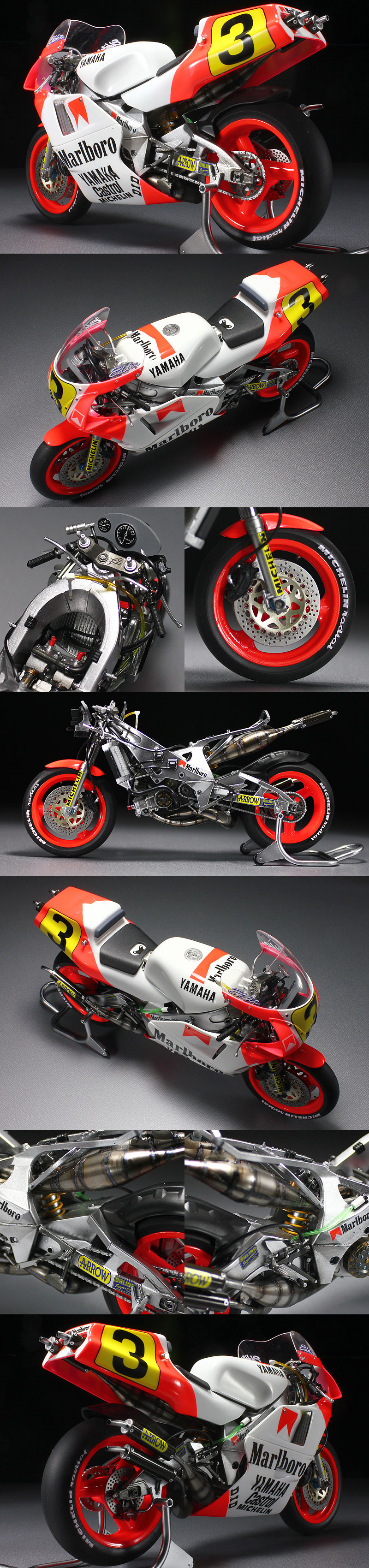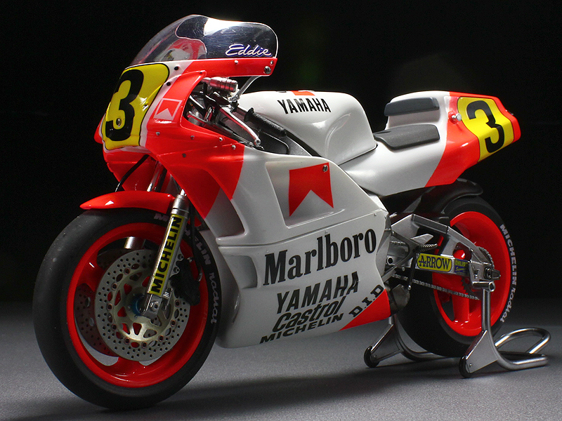 ★基本的にマニュアルに準じた製作です。 ★エンジン、フレーム等の塗装はエナメル系塗料でウォッシング処理を施しています。 ★ブレーキディスク、キャリパー、ステップ等細かいパーツも丁寧に塗り分けました。 ★フロントフォークにミラーフィニッシュを貼りました。★スポンサーデカール(Marlboro)を使用しました。 ★カウルのトップコートはウレタンクリヤー(マルチトップクリヤーSH) ★カウル研出し(ペーパー1000~1500)後→再度ウレタンクリヤー→モデリングワックスで仕上げです。 ☆右側アッパーカウルとセンターカウルの繋ぎ目に接着剤跡があります。☆シールドのデカール(Castrol)がありません。
